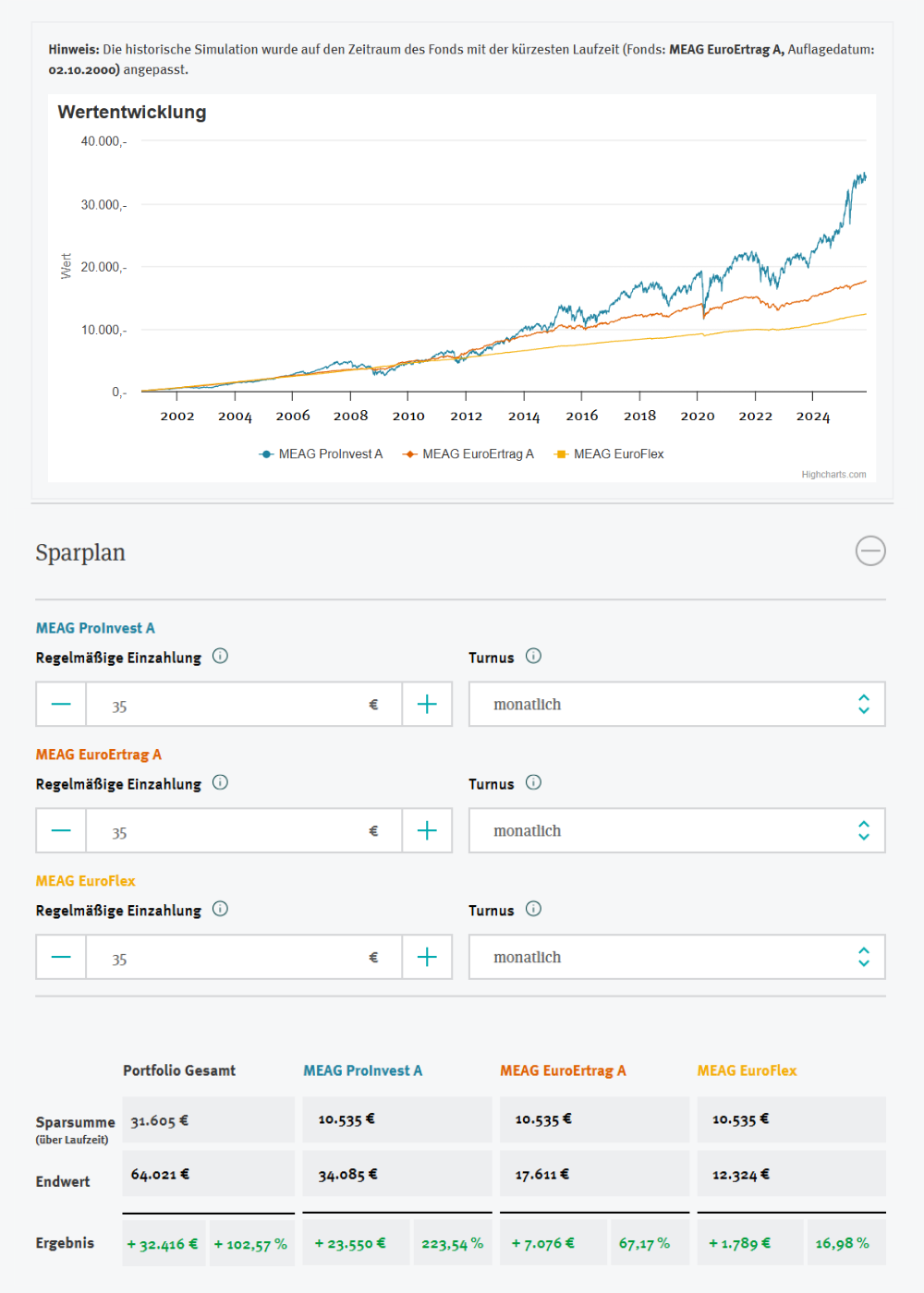 Da bis zu drei Fonds dargestellt werden können, wird außerdem der im Anlegertyp stabil zugeordnete Rentenfonds MEAG EuroFlex, als Beispiel für einen Fonds mit kurzfristigem Anlagehorizont, hinzugefügt.