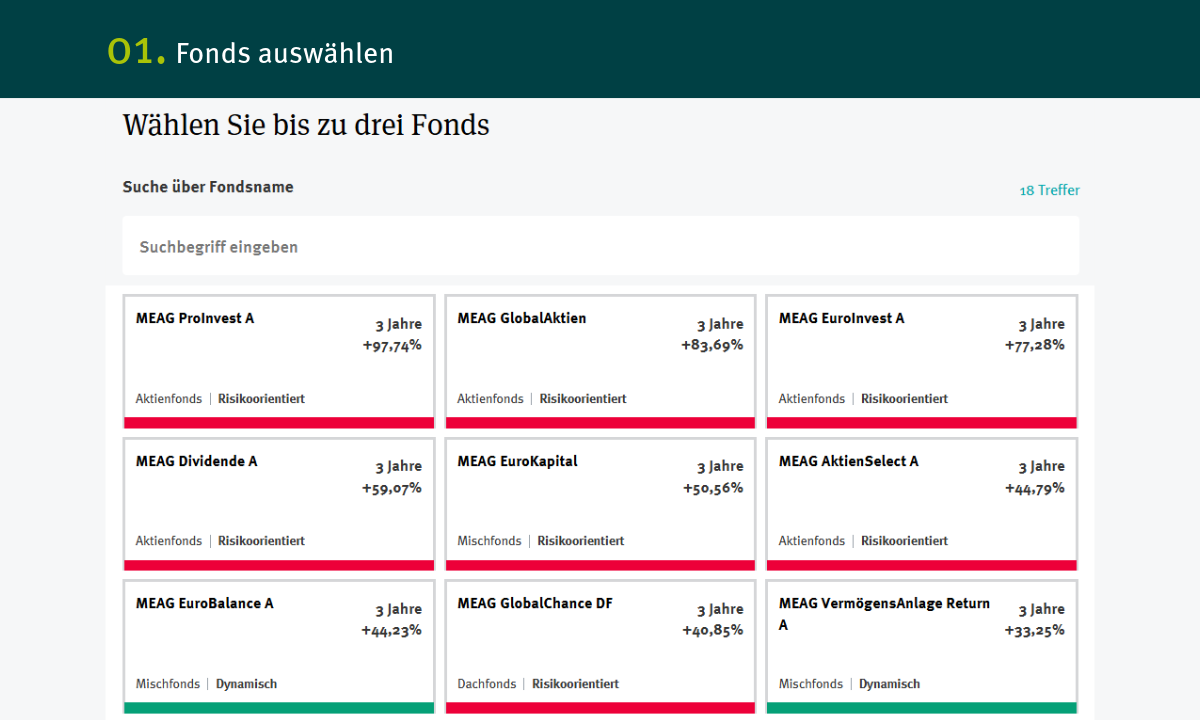 Zunächst wird beispielhaft der risiko- und chancenorientierte Aktienfonds MEAG ProInvest A mit langfristigen Anlagehorizont und erhöhter Volatilität ausgewählt. Die Auswahl erfolgt ganz einfach per Klick auf die entsprechende Kachel oder über die Suchfunktion.